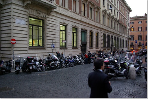 Traffic is a problem for them also. On any given day, there are 4 million people in Rome, 2.5 million cars, and 850,000 scooters. There are only 250,000 parking places! As our guide said "Romans don't park their cars, we abandon them, then pray All Saints that we find them again!" Here's a shot of some parked scooters to give you an idea.